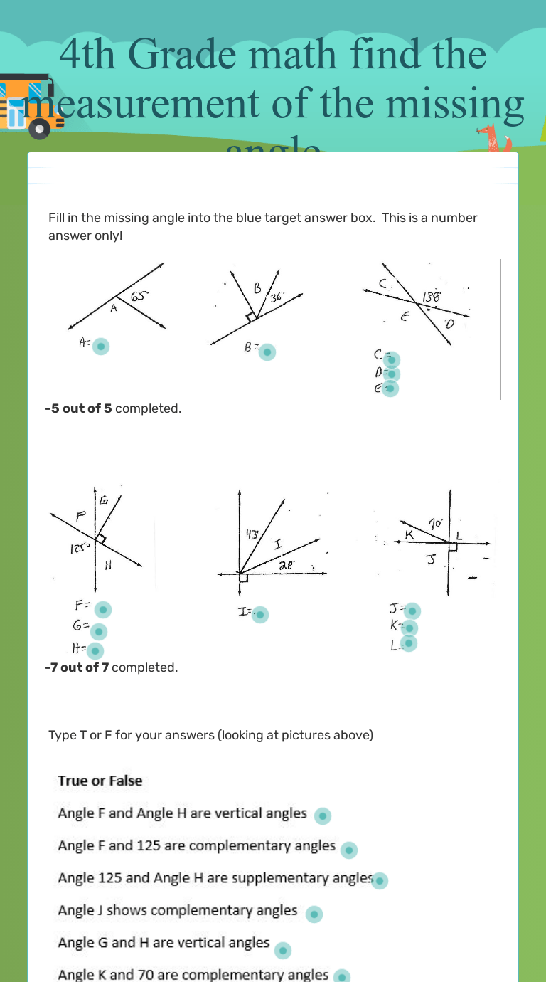 Missing Angle Worksheet 4Th Grade : Complementary Angles Worksheet For 4th 6th Grade Lesson Planet /. Practicing with a protractor worksheet · use a protractor to find the angle worksheet · classifying shapes by their angles and sides video #5. Measure angles worksheet for 4th grade children. This is a math pdf printable activity sheet with several exercises. Naming angles worksheets with answers. These lessons and worksheets will help students learn how to find the sum of smaller angles to form larger angles.